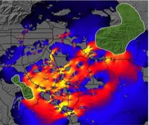 Fig. 1. Current map used to predict important connectivity areas between core habitat patches (green polygons, entered as focal regions) for mountain lions. Warmer colors indicate areas with higher current density. "Pinch points," or areas where connectivity is most tenuous, are shown in yellow. Research Collaborators: Brett Dickson and Rick Hopkins, Live Oak Associates.