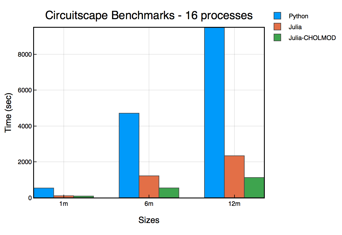 We benchmarked Circuitscape.jl (v0.1.0) with the Python version (v4.0.5) to obtain the following results. We started up Circuitscape with 16 parallel processes, and used benchmark problems from the standard Circuitscape benchmark suite.