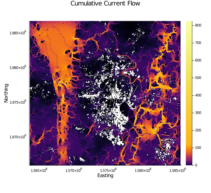 write_outputs = true)(Union{Missing, Float64}[0.0027258956360456245 0.00949946238540265 … 0.7701753044818226 0.5588858207982137; 0.008791599816740273 0.01685623544448697 … 1.1963152183457204 0.8100820554386359; … ; 0.22307355874067347 0.621662091061402 … 0.9836258338404573 0.443012935545784; 0.06824326358051583 0.12451438738405202 … 0.3755969475119765 0.13747736528383855], Union{Missing, Float64}[0.22851654463598325 0.7582581265070772 … 0.8429397856671239 0.5590075422826746; 0.7733371879936655 1.3188749872253167 … 1.2799958538141314 0.7890368128348983; … ; 0.13214272974421676 0.23699796618096516 … 0.4059086986242947 0.2336255195256739; 0.04552497135409578 0.1525431391804039 … 0.23018154785287886 0.06914308189257573], Union{Missing, Float64}[0.011928657683792024 0.012528006035572617 … 0.913677723578187 0.9997822543074038; 0.011368391373430611 0.012780768160558988 … 0.9346242917748058 1.026672066830602; … ; 1.6881258558262553 2.623069307635821 … 2.423268673901695 1.89625232913436; 1.4990292481397935 0.8162568834826198 … 1.6317422096407148 1.988302539036812])You'll see that outputs are written to a new folder called "md_nlcd_omniscape_output". This is specified by the "project_name" value in config above. The cumulative current map will always be called "cum_currmap.tif", and it will be located in the output folder. We also specified in the run configuration that flow potential and normalized current should be computed as well. These are called "flow_potential.tif" and "normalized_cum_currmap.tif", respectively. See Outputs for a description of each of these outputs.