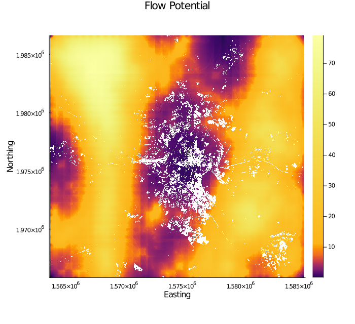 title = "Flow Potential", xlabel = "Easting", ylabel = "Northing",