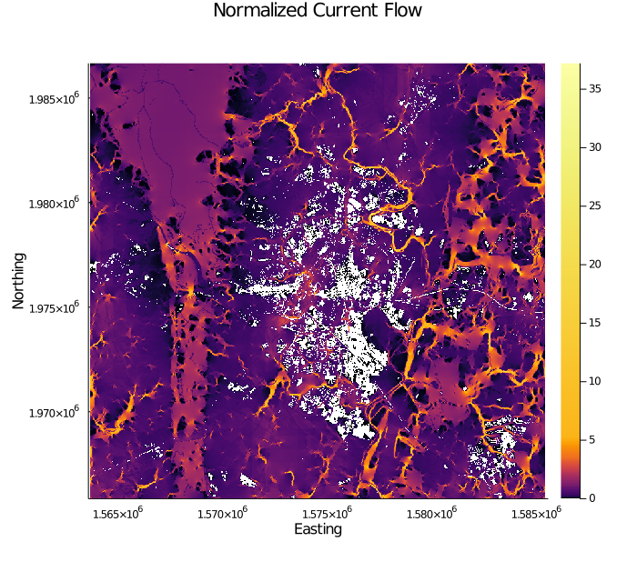 title = "Normalized Current Flow", xlabel = "Easting", ylabel = "Northing",